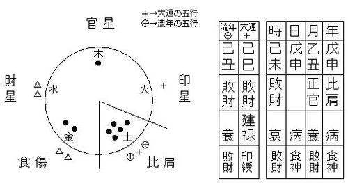 上図はある男性の命式です。(順行10年運、30代の大運は比肩 冠帯、40代の大運は敗財 建禄) 時柱に敗財があり、この年は大運・流年にも敗財が並んでいます(2009年:己丑の流年)。 日干:戊で五行の土にも5つの星(●●●●●)が固まっていますが、この年は大…