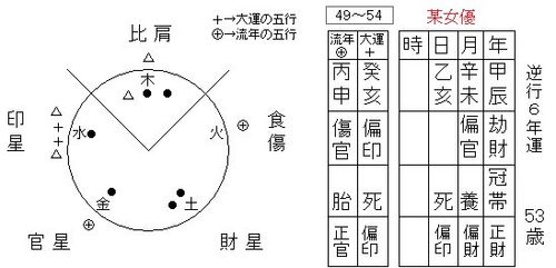 上図は、先日記者会見を開いた或る女優さんの命式です。 彼女の命式は… 日干:乙の天干に偏官と劫財とが並ぶ命式です。 この並びの命式の方は、ボーイッシュな性格で、家庭よりも仕事に生きるタイプです。 また、中心星が偏官の方は、男の代わりに仕事をする…