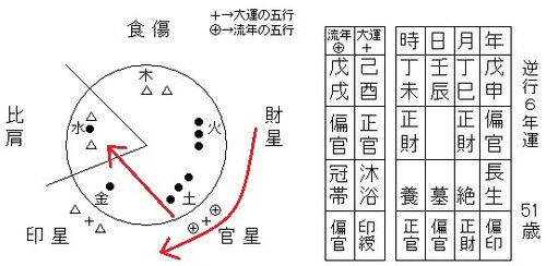 上図の命式はXさんの命式です。 日干:壬の天干に正財と偏官が並ぶ命式で、五行を見ますと、火の財星と土の官星に星(●)が3つずつ固まっている命式です。 この星の並びは財官双美の形になります。 財星は優しさや家庭性を表し、官星は責任感や仕事を表し…