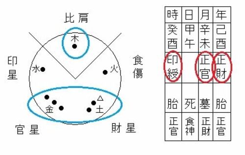 上図は私の知人の命式です。 彼の命式は日干:甲で、天干の並びは正官を中心とした正財と印綬の並びの命式です(財官印三宝の命)。 五行(木火土金水の丸い円)を見ると…(●=1、△=0.5) 木(比肩)● 火(食傷)● 土(財星)●●△ 金(官星)●●● 水(印星)…