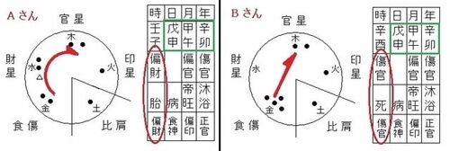 上図は、同じ日に生まれた方の命式です。 年月日の三柱だけで見ますと… 戊日干で、天干の並びは偏官と傷官との並びの命式です。 偏官と傷官との並びの命式は少々ガタガタしやすいところがあります。 「傷官十干記」では、土(戊・己)日干の傷官は「官去って…