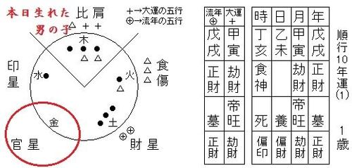現在、2018年3月4日(日)、午後22:40分。…上図はこの時間に生れた男の子の命式です。 彼の命式は… 1.日干:乙の月上の劫財を中心とする正財と食神との並びの命式。 2.気の流れは月上の劫財が時上の食神を生じ、時上の食神が年上の正財を生じる並び。 …