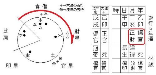 上図は或る女優さんの命式です。 彼女は名女優として成功したが、息子の事では苦労が絶えない。 最近も息子さんの事で様々…。 そこで、彼女の命式を出してみました。 ・日干:己丑、 ・天干の並びは偏印を中心とする食神と偏官の並び(偏官倒食)。 ・五行を…