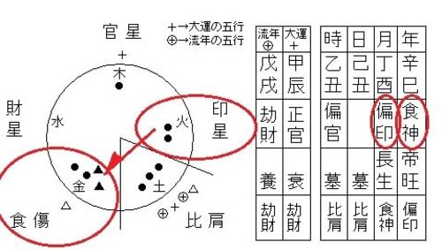 上図は或る女優さんの命式です。 彼女は名女優として成功したが、息子の事では苦労が絶えない。 最近も息子さんの事で様々…。 そこで、彼女の命式を出してみました。 ・日干:己丑、 ・天干の並びは偏印を中心とする食神と偏官の並び(偏官倒食)。 ・五行を…