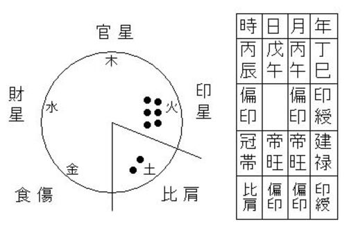 上図はある架空の女性の命式です。 (彼女の命式は…) 日干:戊で、天干の並びは偏印を中心とする印綬と偏印の並び。 五行を見ると火の印星に星(●)が6個も固まり、太過した火が火生土と土を生ずる。 少々偏った命式ですが、この様なことも考えられる…。 印…