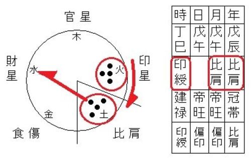 上図はある架空の女性の命式です。 彼女の命式は・・・ ・日柱:戊午 帝旺(羊刃) ・天干の並びは、比肩と印綬の並び。 ・十二運は全て旺相している。 ・五行火の印星と土の比肩のみに星(●)が固まっている。 命式本体の天干の並びは表で、五行は中身(裏…