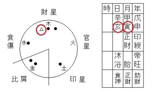 上図は、ある女性の命式です。 彼女の命式は… ・日干:辛 ・天干の並びは、月上の正財を中心とする印綬との並びの命式。 ・月支:寅と日支:亥が支合して木の財星に新たなエネルギーが生じている(△…亥寅で出来た五行)。 ・月上の正財は親の不動産を表し、…