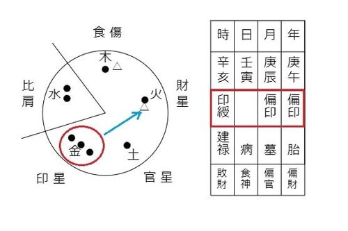 当方の流派では地支よりも天干の並びを重要視します。 上図は男性の命式です。 日干:壬で、天干の並びは印星三並び(偏印・偏印・印綬)。 五行(木火土金水)には星(●)が全部入っています。 しかし、金の印星に星(●)が3つと固まっているのが特徴です…