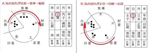 上図は或る二人の男性の命式です。 二人共、日干:壬です。 左側のAさんの命式は、五行的には 比肩→食傷→財星と気が流れる命式で、 右側のBさんの命式は、正官→印綬→比肩と気が流れる命式です。 同じ壬ですが、タイプは逆の命式とも言えます。 Aさんは月上・…