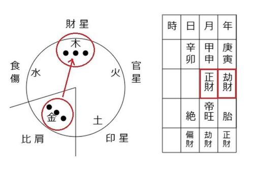 上図の命式は… 日干:辛で… 生時不明での天干の並びは、月上に正財 帝旺、そして年上に劫財とが並びます。 劫財は、正財を壊す星(変通星)ですので、横の並びは嫌ですね… また、年月の柱を縦に見ると、共に正財とそれを剋す劫財との関係… 縦の関係も気にな…