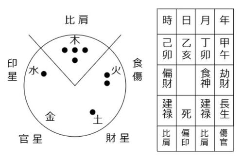 上図はタイプが異なる五行です。 四柱推命の命式は、年月日時の四つの柱で出来ています。 そして、各柱は各々干支で出来ていますので、全部で8個の星でできています。 ですから、四柱推命のことを「八字」ともいうのですね…。 上図は、二つの異なる五行図で…