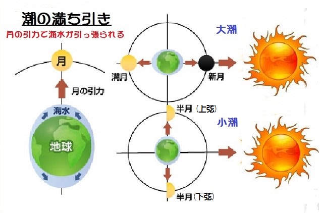 (実際に起こる海面の盛りあがりは、海水と地球の摩擦や、地球の時点作用により大潮は朔望の1~2日後、小潮は上弦、下弦の1~2日後に起こります。)